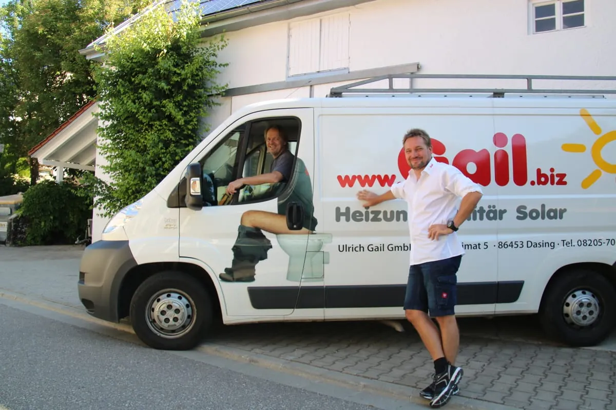 Die Sanitärfirma Gail aus Dasing hat sich bei ihrer Außenwerbung etwas einfallen lassen: Sie ließ einen ihrer Firmenwagen mit dem Foto eines Mannes bedrucken, der gerade mit heruntergelassener Hose auf der Toilette sitzt. In der Folge sieht es so aus, als ob der fahrende Installateur gerade auf dem stillen Örtchen weilt, während er zum Kunden fährt.