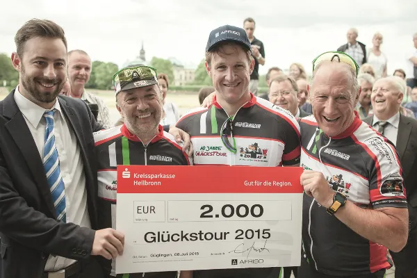 Auf der Glückstour 2015 konnten eingegangene Spenden aus dem Jahre 2014 in Höhe von 34 x 4.300 € verteilt und neue Spenden für die Glückstour 2016 eingesammelt werden. Zum dritten Mal mit von der Partie, auf der letzten 160 km Etappe von Leipzig nach Dresden, trat auch der Olympiasieger im Gewichtheben und Afriso-Markenbotschafter Matthias Steiner mit Schwung in die Pedale. Matthias Steiner ist überzeugt: „Die Idee, dass man am Ende der einzelnen Etappe jeder Hilfsorganisation den gleichen Betrag übergibt, und dann auch noch erfährt, was mit dem Geld gemacht wird, ist ganz große Klasse. So bekommt zum Beispiel auf einem Marktplatz ein Mädchen ein Fahrrad überreicht, das dieses dringend notwendig hat, und wenn man dann sieht, wie sehr sich das Kind darüber freut, das ist schon die Quintessenz der Tour. Da wird das Radfahren beinahe zur Nebensache, aber trotzdem, es zieht die Aufmerksamkeit auf die Sache auf sich und das ist auch sehr gut so.“
