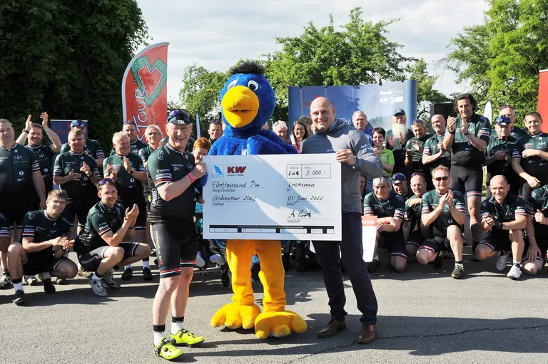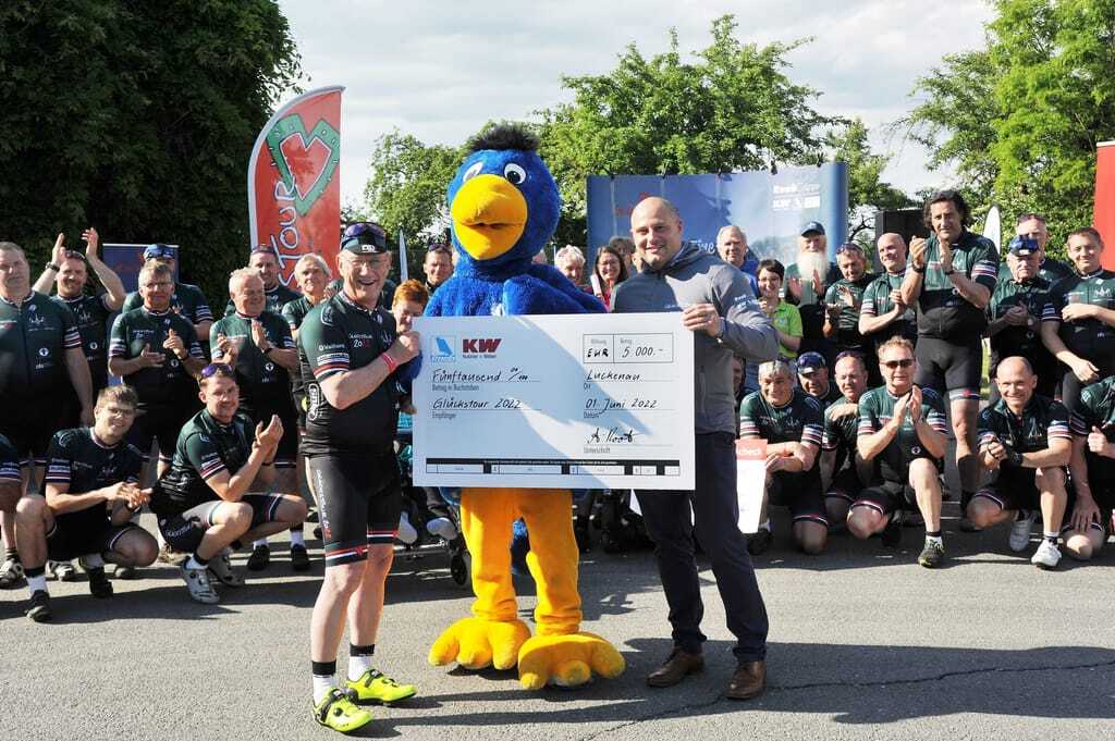 Alexander Root übergab im Namen der Raab-Gruppe einen Spendenscheck in Höhe von 5.000 Euro an die Radfahrerinnen und Radfahrer für den Verein „Glückstour – Schornsteinfeger helfen krebskranken Kindern e. V.“. Der Zwischenstopp in Luckenau wurde auch für Spendenübergaben an Initiativen aus der Umgebung genutzt. Somit sind die Schornsteinfeger:innen in der Tat wahre Glücksboten.