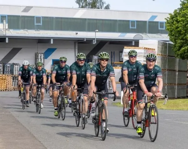 Die radelnden Schornsteinfeger auf der Glückstour von Erfurt nach Leipzig. Am 9. Juni macht die Glückstour in Ergoldsbach beim Schornsteinhersteller Erlus Halt. – © Verein Glückstour e. V.