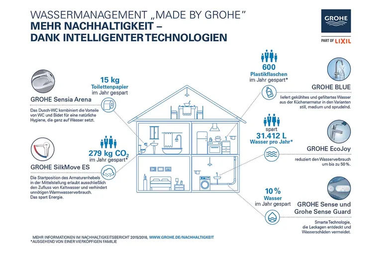 Wie der Hersteller erklärt, ist das Streben nach größtmöglicher Nachhaltigkeit ist ein integraler und wesentlicher Bestandteil der DNA von Grohe und neben Qualität, Technologie und Design Kernwert der Marke. Grohe verfolgt nach eigenen Angaben konsequent einen Ansatz der 360-Grad-Nachhaltigkeit, der die definierten Handlungsfelder Mitarbeiter, Lieferanten, Fabriken, Prozesse, Produkte und den Beitrag zur Gesellschaft gleichermaßen umfasst. Grohe orientiert sich zudem an den 17 Zielen für nachhaltige Entwicklung (Sustainable Development Goals, SDGs) der Vereinten Nationen. Dazu zählt zum Beispiel die Verfügbarkeit und nachhaltige Bewirtschaftung von Wasser und Sanitärversorgung (Ziel 6).