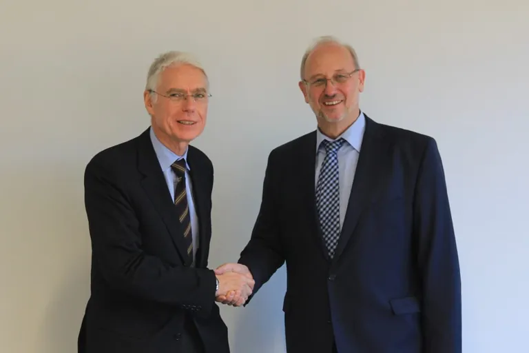 Michael Mager (li.), Grohe Executive Director Personnel & Organisation, und Hans-Jürgen Dörrich (re.), Leiter Unternehmenskooperation Don Bosco Mondo, bei der Unterzeichnung des Kooperationsvertrags. – © GROHE