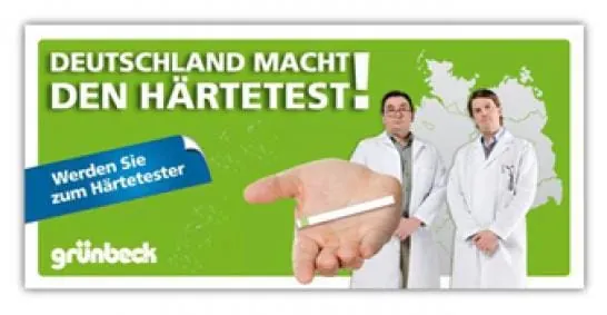„Deutschland macht den Härtetest“ lautet das Motto einer Mitmach-Aktion für Verbraucher von Grünbeck. Dabei entsteht ein bundesweiter Härteatlas. Ziel der Aktion ist, dass sich Verbraucher selbst über die Härtewerte ihres Trinkwassers informieren. Dazu haben sie die Möglichkeit, selber ihre Wasserqualität zu testen. Hierzu stellt Grünbeck Mess-Stäbchen zur Verfügung, mittels derer schnell eine Unterscheidung von hartem und weichem Wasser möglich ist. Das Messergebnis können die Kunden auf der Internetseite www.ich-will-weiches-wasser.de auf einer Deutschlandkarte eintragen. So entsteht ein bundesweiter Härteatlas mit aktuellen Ergebnissen. Zusätzlich bekommen die Verbraucher durch die Teilnahme bei „Deutschland macht den Härtestest“ eine individuelle Auskunft über ihre Wasserqualität. Diese Information kann sehr wichtig sein für die korrekte Dosierung von Waschmitteln oder die Planung einer Wasseraufbereitungsanlage im eigenen Haus oder in einer Wohnanlage. „Deutschland macht den Härtetest“ ist als Aktion langfristig angelegt und soll mindestens zwei Jahre lang laufen.