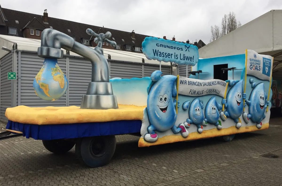 Grundfos nimmt im Februar zum ersten Mal mit einem eigenen Motivwagen am Rosenmontagszug in Düsseldorf teil. Unter dem Motto „Wasser is Läwe“ (Wasser ist Leben) wird die Versorgung mit sauberem Wasser überall auf der Welt thematisiert.