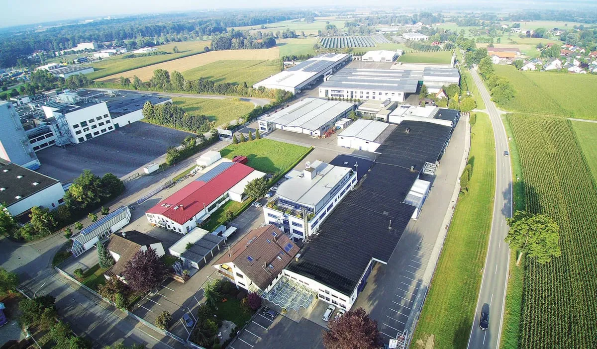 Das Firmengelände in Günzburg. Foto: Günzburger Steigtechnik Redaktionelle Verwendung erlaubt, Abdruck honorarfrei, Beleg an: Jensen media, Hemmerlestraße 4, 87700 Memmingen, Telefon 08331/991880, info@jensen-media.de