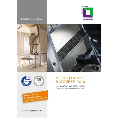 Der neue Steigtechnik-Ratgeber 2018 ist da. Er umfasst 236 Seiten und ist damit so umfangreich wie nie zuvor. Neben dem Standardsortiment der Günzburger Steigtechnik enthält er auch über die Änderungen der DIN EN 131-1/-2 und DIN EN ISO 14122.