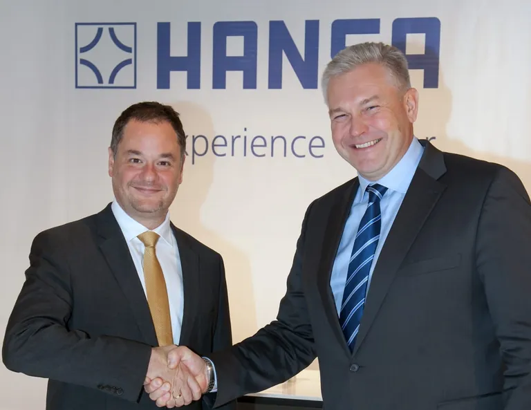 Georgios Kabitoglou (links), neuer Chief Business Officer für Hansa, und Pekka Kuusniemi (rechts), President und CEO der Oras Group. – © Hansa Armaturen GmbH