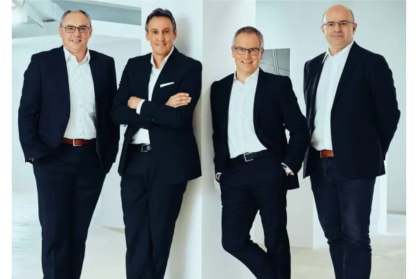 „Meine Vorstandskollegen und ich freuen uns, dass wir mit dieser Corona-Prämie bei allen Mitarbeiterinnen und Mitarbeitern Danke sagen können. Wir sind überzeugt, dass wir mit unserem Hansgrohe Teamgeist auch die zukünftigen Herausforderungen meistern werden,“ so Hans Jürgen Kalmbach (2. v. l.), Vorsitzender des Vorstands, Hansgrohe SE. Vorstand der Hansgrohe SE: Frank Semling, Hans Jürgen Kalmbach (Vorsitzender), Reinhard Mayer (stellv. Vorsitzender), Christophe Gourlan (v. l.)