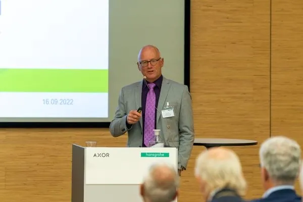 Um diese Dringlichkeit weiß auch Gastgeber Hans Jürgen Kalmbach. Der Vorsitzende des Vorstands der Hansgrohe SE berichtete, dass alle globalen Standorte des Unternehmens im Hinblick auf ihre eigenen Emissionen jetzt klimaneutral seien. Er stellte auch das Leuchtturmprojekt des Armaturen- und Brausenherstellers vor: Grün. Grüner. Eco 2030.