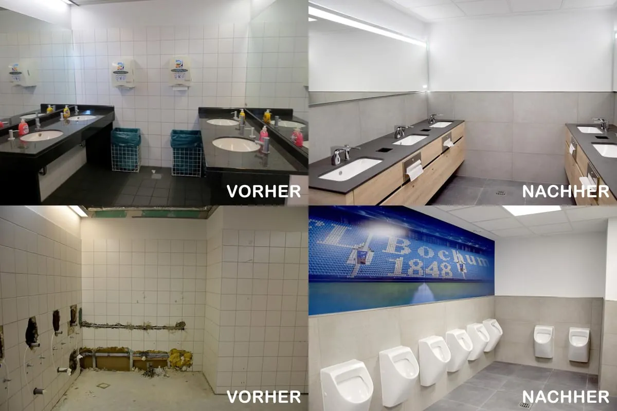 Nach nur 14-tägiger Umbauphase wurden moderne und energiesparende Toiletten im typischen Hasenkamp-Design umgebaut. „Funktionalität und Ästhetik schließen sich nicht aus, wenn Räume für Menschen gestaltet werden“, erklärt Lisa Pötter. Die Bad-Designerin hat gemeinsam mit dem VfL Bochum 1848 ein zeitloses, sportlich anmutendes und für die Bedürfnisse optimales Designkonzept entwickelt und umgesetzt (Vorher-Nachher-Vergleich in den Bildern).