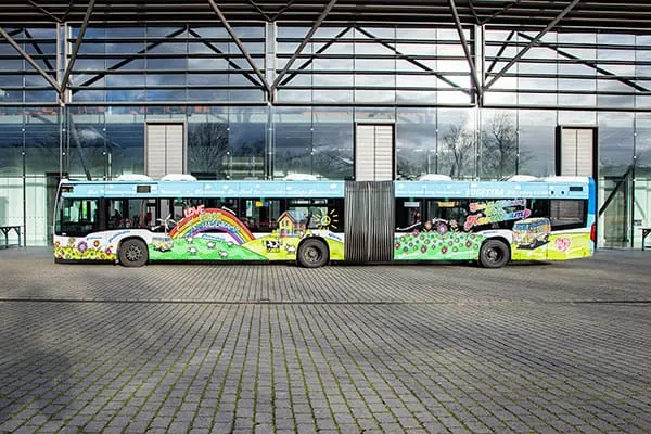 Auf dem Außengelände der Jahrhunderthalle in Bochum stellte der Meisterbetrieb einen künstlerisch gestalteten Gelenkbus der Bogestra vorgestellt und will so auf seine Innovationskraft aufmerksam machen. Gemeinsam mit dem Illustrator Helge Jepsen entwickelte das Hasenkamp-Kreativteam einen Bus im Hippie-Style.