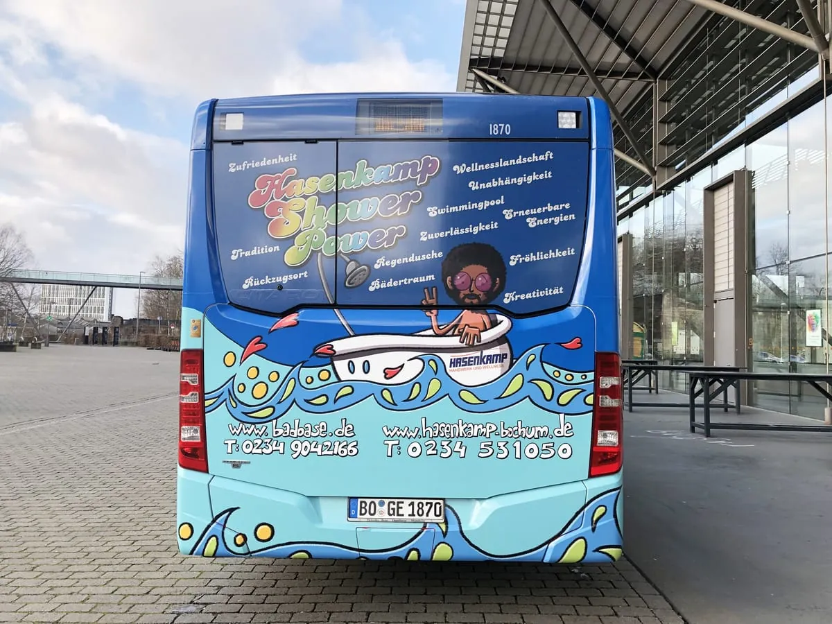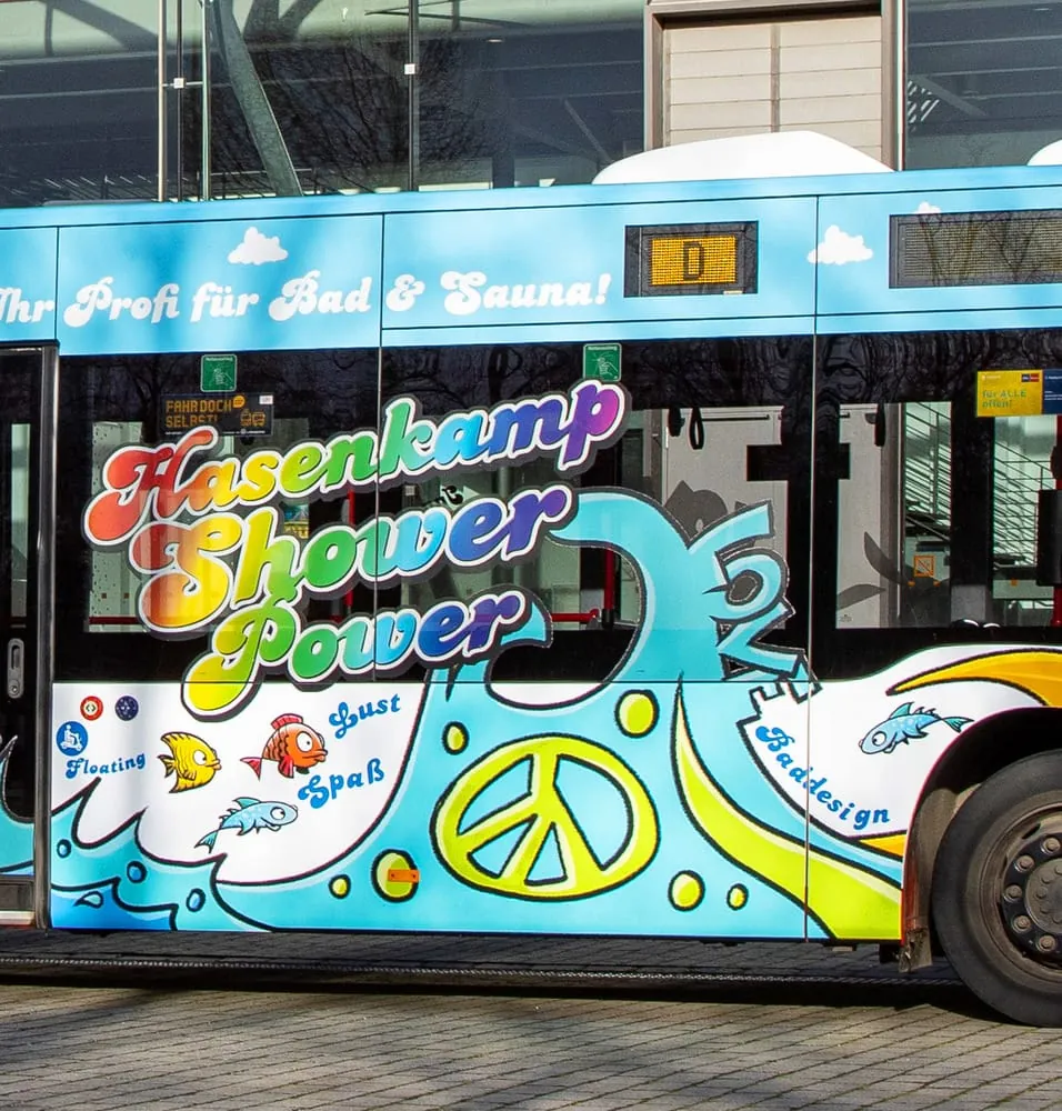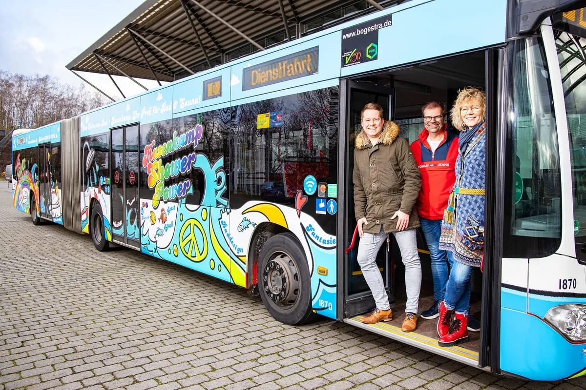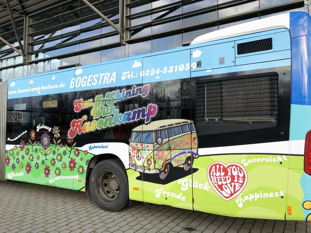 „Mit diesem kunterbunten Gelenkbus wollen wir die positiven Emotionen und Lebenseinstellungen dieser besonderen Jahre wieder aufleben lassen. Gerade in der aktuellen Zeit, wo oft negative und düstere Nachrichten die Medien dominieren, ist die Botschaft für ein Leben in Freiheit, Verantwortung, Frieden und Harmonie umso wichtiger“, erläutert Heinz Hasenkamp. An dieser Stelle knüpft der Familienbetrieb auch mit seiner Werbebotschaft an und stellt das Thema Nachhaltigkeit und ökologische Verantwortung, durch innovative Produkte, wie zum Beispiel umweltfreundliche Heiztechnik, in den Vordergrund. Gleichzeitig soll das persönliche Wohlbefinden nicht außer Acht gelassen werden: Hier dient das eigene Wellnessbad oder die eigene Sauna als Rückzugsort zur körperlichen Entspannung und Regeneration.
