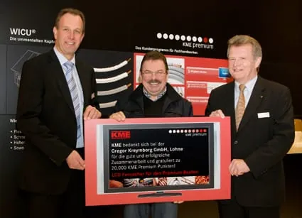 Gregor Kreymborg aus Lohne (Mitte) erhielt von Ulrich Stahl, Leiter der Technischen Kundenberatung bei KME (rechts), einen LCD-Fernseher. Mit ihm freut sich KME-Vertriebsmitarbeiter Frank Dettmer (links).