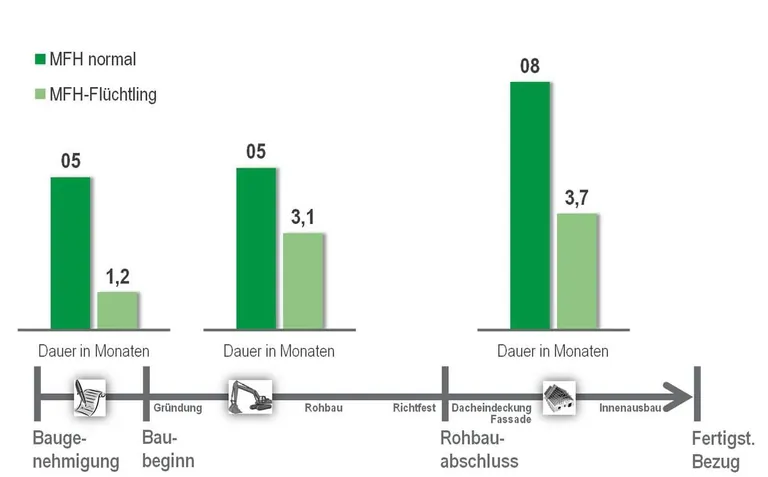 Vergleich der Bauzeiten von Mehrfamilienhäusern: Deutliche Verkürzungen können in allen Bauphasen beobachtet werden, wenn der Neubau im Flüchtlingskontext steht. – © Heinze GmbH