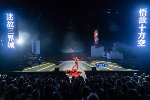 Bei der Performance des chinesischen Künstlers Tianzhuo Chen verschmelzen Musik, Tanz, Körper und Bilder in einer visuell-akustischen Ekstase. Die Bühnencharaktere pushen sich in verschiedenste Versionen von Göttlichkeit – und nutzen die große Bühne für ihre karnevaleske Rivalität, wobei Realität und Fantasie zu verschwimmen scheinen. In seiner Inszenierung integriert Tianzhuo Chen zudem ein Wasserbecken in die Bühne, in dem die Darsteller zeitweise performen.