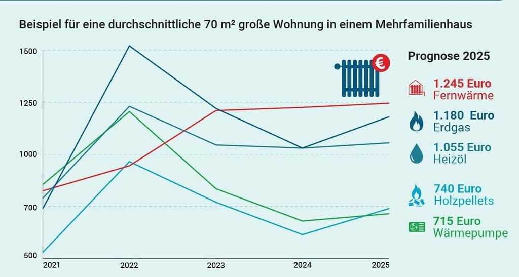 2025 dreht sich der Trend jedoch um: Gas (+15 %) und Holzpellets (+20 %) werden deutlich teurer, während die Kosten für Wärmepumpen (+5 %), Heizöl (+3 %) und Fernwärme (+2 %) nur moderat ansteigen. Hauptursachen sind höhere Energiepreise und der kalte Winter zu Jahresbeginn.