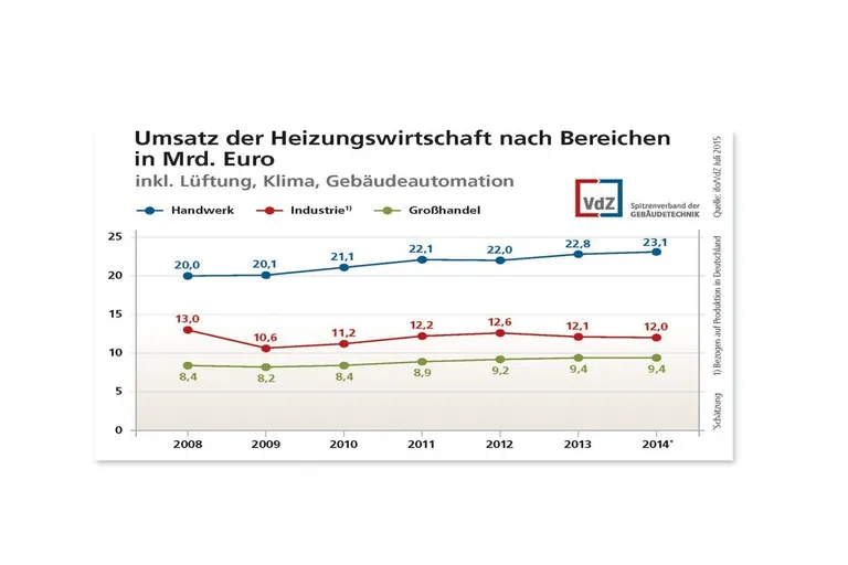 Die positive wirtschaftliche Entwicklung und die stabile Baukonjunktur in Deutschland wirkten sich besonders für die auf den heimischen Markt ausgerichteten Bereiche Großhandel und installierende Unternehmen vorteilhaft aus. Der vom installierenden Gewerbe erwirtschaftete Umsatzanstieg belief sich auf 1,3 Prozent, von 22,8 Mrd. Euro im Jahr 2013 auf 23,1 Mrd. Euro im Jahr 2014. Die Umsätze des Großhandels lagen unverändert bei 9,4 Mrd. Euro. Für den Industriebereich schätzt das ifo Institut für 2014 Erlöse von 12 Mrd. Euro, ein leichtes Minus von 0,8 Prozent im Vergleich zum Vorjahr.
