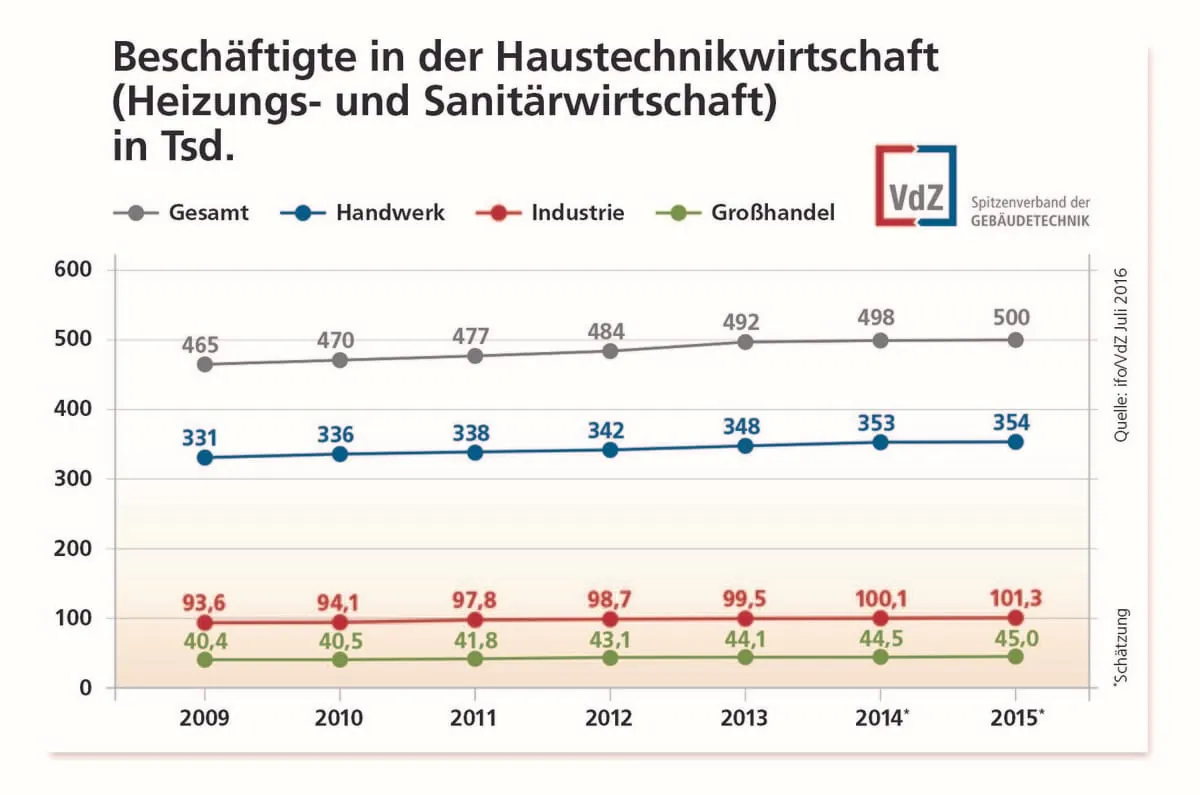 Die Zahl der Beschäftigten ist nach Angaben des ifo Instituts 2015 in der gesamten Haustechnikwirtschaft (inkl. Sanitärwirtschaft) von 498.000 auf 500.000 gestiegen. Das überwiegend mittelständisch organisierte Handwerk beschäftigte im Jahr 2015 insgesamt 354.000 Angestellte, ein Plus von 0,3 Prozent gegenüber dem Vorjahr. Im Großhandel stieg die Zahl der Beschäftigten um 1 Prozent, von 44.500 im Jahr 2014 auf 45.000. Die Beschäftigungszahlen in der Industrie stiegen um 1,2 Prozent. Etwa 101.300 Arbeitnehmer waren 2015 in diesem Branchenbereich tätig.