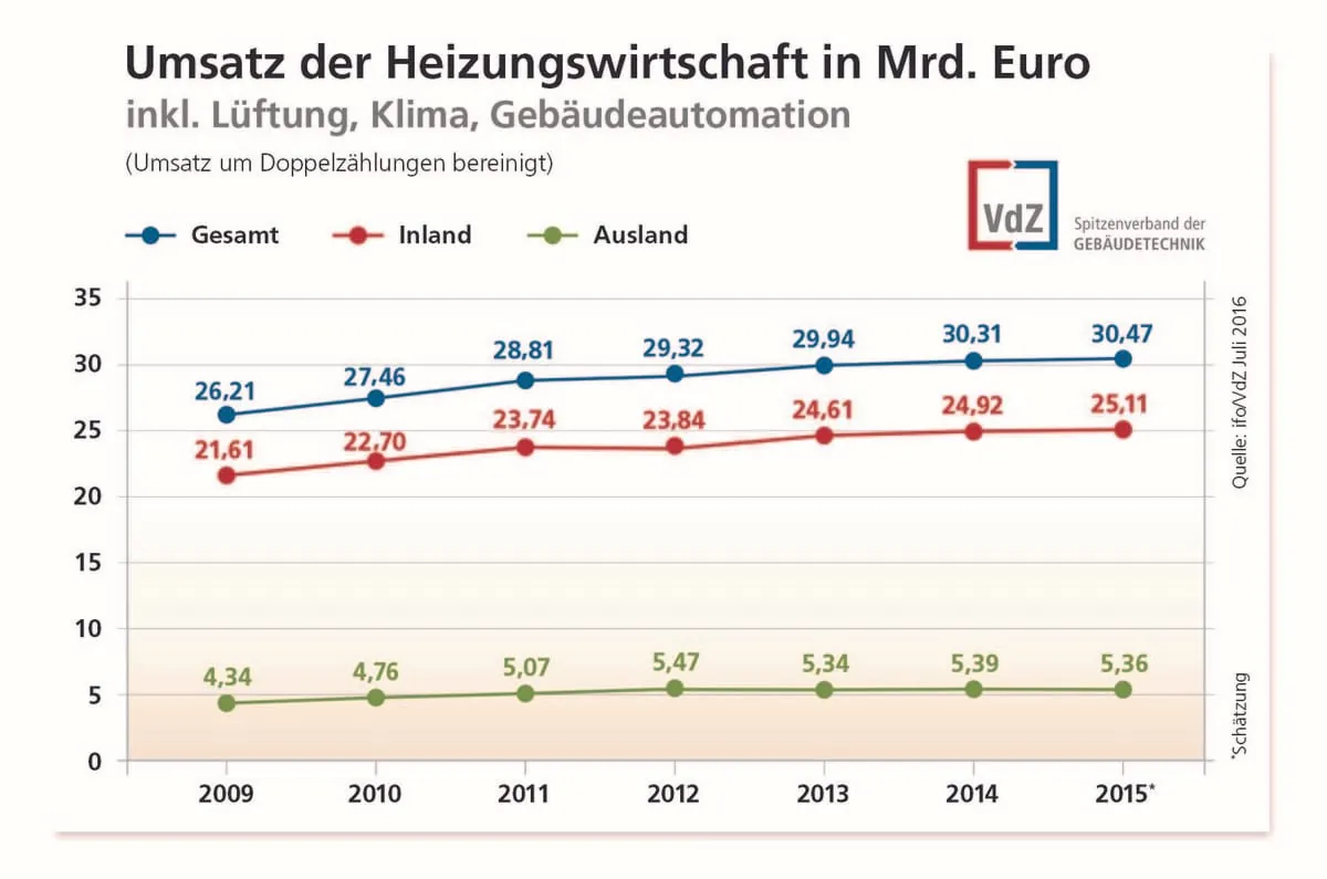 Im zentralen Industriebereich „Herstellung von Heizungsanlagen“ waren die Umsätze 2014 wegen deutlich geringerer Investitionen um fast ein Zehntel zurückgegangen. Diese Entwicklung konnte 2015 umgekehrt werden. Trotz der von 25 Prozent auf 21 Prozent gesunkenen Exportquote wurden 2,8 Mrd. Euro erwirtschaftet. Im Jahr 2014 waren es 2,6 Mrd. Euro.