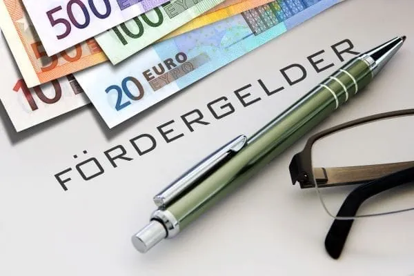 Geldscheine, Schriftzug Fördergelder, Kugelschreiber und Brille