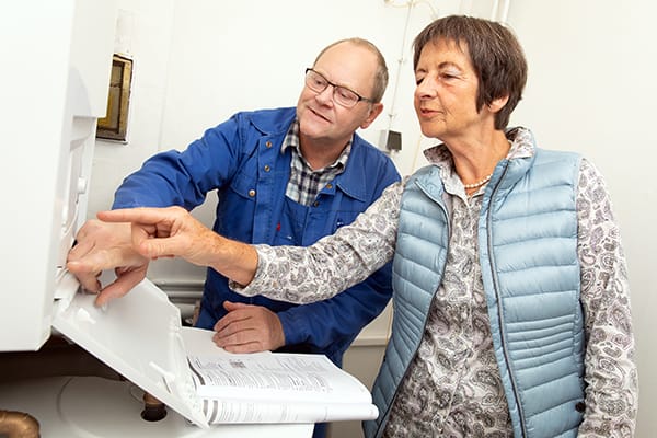 Ein Fachhandwerker erklärt einer Modernisiererin die neue Gasheizung. – © Michael Setzpfandt/Zukunft Erdgas