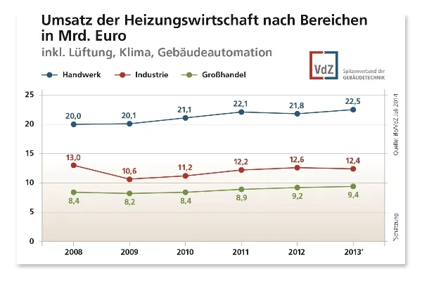 2013 erwirtschaftete die gesamte Heizungs- und Lüftung/Klimabranche einen Umsatz von 29,79 Mrd. Euro. Das ist ein Plus von 2,3 % gegenüber 2012 mit einem Branchenumsatz von 29,11 Mrd. Euro. Im Inland belief sich der Umsatz auf 24,38 Mrd. Euro – 2012 waren es noch 23,64 Mrd. Euro, was einem Zuwachs von 3,1 % entspricht. Für das Auslandsgeschäft schätzte das ifo Institut 2013 ein Volumen von 5,41 Mrd. Euro gegenüber 5,47 Mrd. Euro im Jahr 2012. Trotz des leichten Rückgangs im Auslandsgeschäft war die Branche Haus- und Gebäudetechnik von der 2013 nochmals an Dynamik verlierenden Wirtschaft weniger betroffen als andere Branchen. Die Umsätze der Marktsegmente Großhandel und Installierendes Gewerbe stiegen leicht an, in der Heizungsindustrie blieben die Umsätze nahezu unverändert.