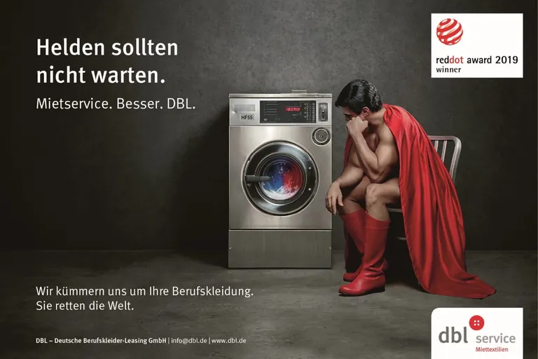 Die Aussage der Kampagne lautet daher: Diese „Helden sollten nicht warten”, sondern immer einsatzbereit sein. Und dafür sorgt die DBL mit ihrem bundesweiten Netzwerk regionaler textiler Mietdienstleister. Die Umsetzung der Kampagne überzeugte die Jury des Red Dot Awards. Sie zeichnete das Konzept für hohe Designqualität und Kreativität im Bereich „Brands & Communication Design 2019“ aus. Der Award ist mit seinen Einreichungen von Designern, Unternehmen und Organisationen aus über 70 Nationen einer der größten und renommiertesten Designwettbewerbe weltweit.
