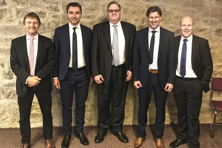 Neuer und alter Vorstand des Herstellerverbandes Raumlufttechnische Geräte e. V. (v. l.): Günther Mertz, Geschäftsführer, der wiedergewählte stellvertretende Vorsitzende Christian Weger, der neue Vorsitzende Andreas von Thun, der stellvertretende Vorsitzende Udo Ranner, der bisherige Vorsitzende Frank Ernst. – © Herstellerverband Raumlufttechnische Geräte e. V.