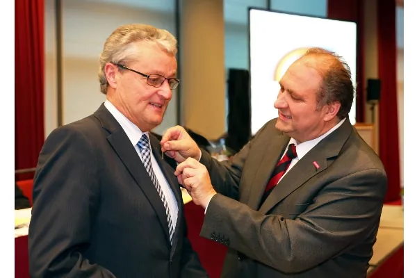Manfred Stather, der Präsident des Zentralverbandes Sanitär Heizung Klima (ZVSHK), bekam das Handwerkzeichen in Gold verliehen.