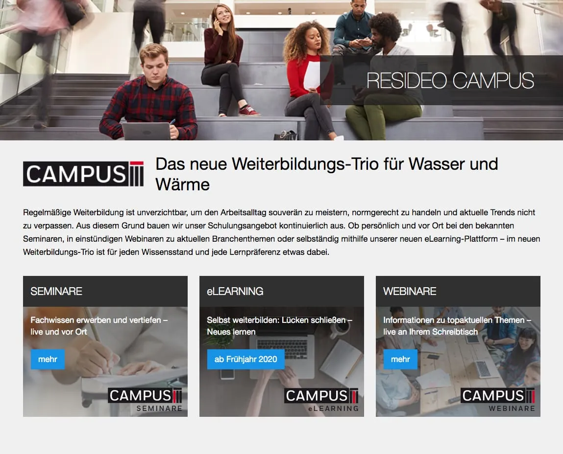 Berufliche Weiterbildung ist entscheidend, um in der alltäglichen Installationspraxis immer normgerecht zu arbeiten und auf dem aktuellen Stand der Technik zu sein. Aus diesem Grund baut Resideo das Schulungsangebot kontinuierlich aus und stellt es künftig auf drei Säulen: Die bewährten Seminare werden durch einstündige Webinare und ab dem Frühjahr 2020 durch eine neue eLearning Plattform zu einem Weiterbildungs-Trio ergänzt. Gebündelt wird das gesamte Programm als Resideo Campus. Profis und Berufsanfänger können dort je nach Wissensstand und persönlicher Lernpräferenz entscheiden: In die Tiefe gehende, persönliche Vermittlung von Fachwissen, aktuelle Informationen zu Branchentrends im Webinar oder Basiswissen vom eigenen Schreibtisch aus.