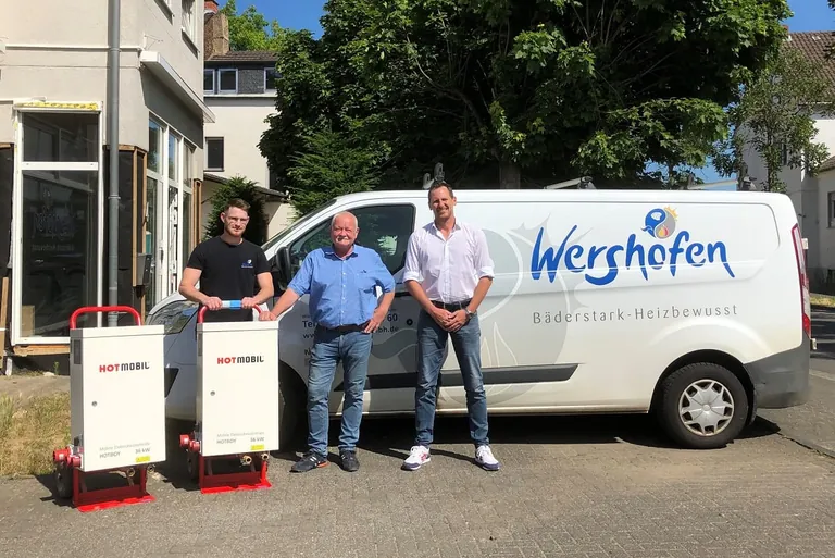 „Nach dem Winter erkundigte sich das Team der Firma Wershofen bei uns, ob sie unsere Elektroheizzentralen noch weiter einsetzen könnten. Wir haben uns dann dazu entschieden, ihnen die insgesamt fünf Geräte zu überlassen“, berichtet René Wagemann, der bei Hotmobil zuständige Außendienstmitarbeiter für das Rhein-Ruhr-Gebiet. Die symbolische Übergabe der Geräte durch René Wagemann fand im Juni 2022 auf dem Firmengelände der Wershofen GmbH statt.