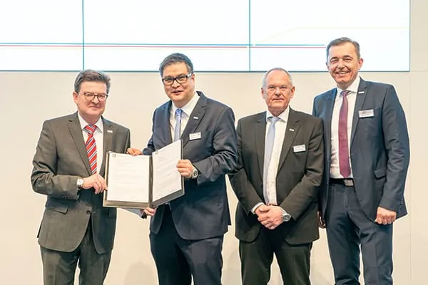 Haftungsübernahmevereinbarung nach neuestem Zuschnitt (v.l.): ZVSHK-Hauptgeschäftsführer Helmut Bramann, Johannes Rump, Bernhard Schaub (beide Oventrop) und ZVSHK-Präsident Michael Hilpert nach Unterzeichnung der HÜV 2.0 auf der ISH am 12. März 2019. – © ZVSHK