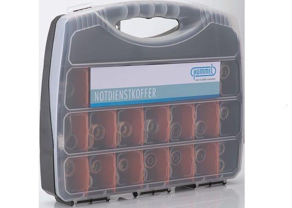 Von Hummel ist ein Notdienstkoffer mit allen gängigen Verbindungen für Metall- und Kunststoffrohre verfügbar. In dem kompakt gehaltenen Koffer sind Klemmverschraubungen, Anschlussnippel und Flachdichtungen für nahezu jeden Typ an Heizungs- und Trinkwasserrohren enthalten.