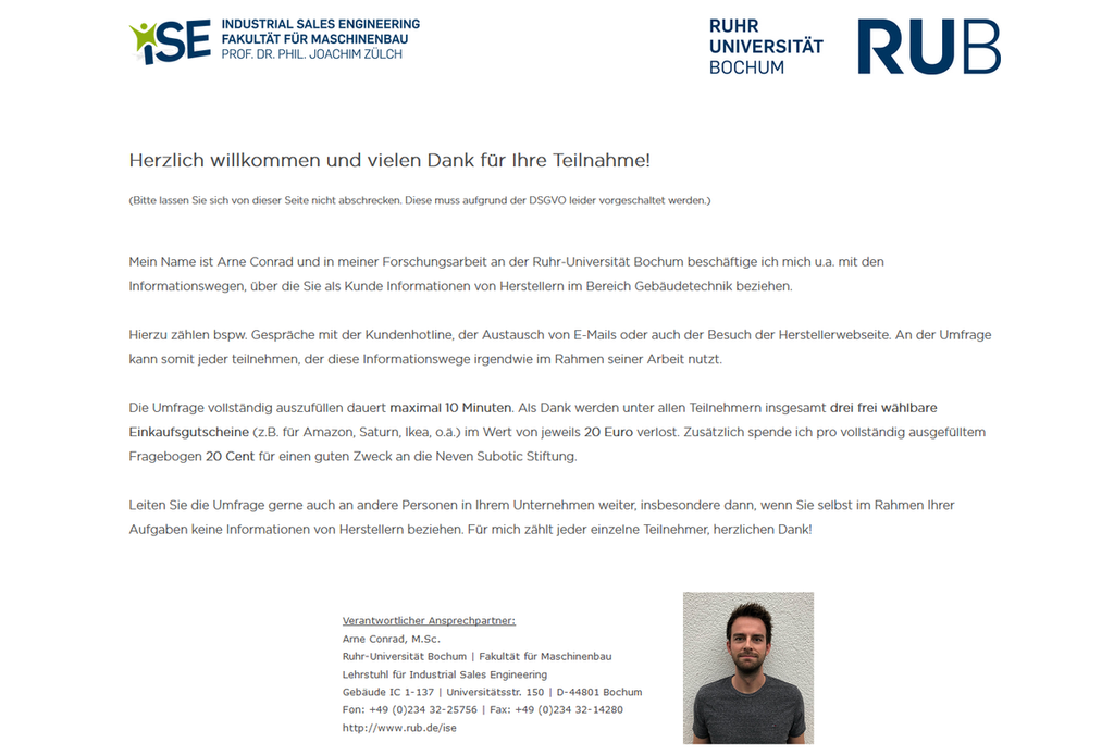 Im Rahmen seiner Dissertation an der Ruhr-Universität Bochum führt Arne Conrad eine Umfrage zur Qualität der Informations- bzw. Kontaktkanäle zwischen Fachhandwerksbetrieben und Herstellern von Produkten in der SHK-Branche durch.