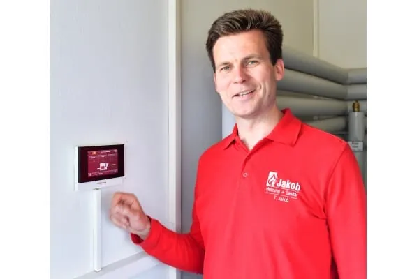 Die in der Heizzentrale im Firmengebäude erzeugte Wärme gelangt über ein insgesamt etwa 60 Meter langes Nahwärmenetz in die beiden anderen Häuser. Heizwasser-Pufferspeicher in jedem Gebäude versorgen jeweils zwei Heizkreise und liefern auch das benötigte Warmwasser zum Duschen, Waschen und Kochen, außerdem nehmen sie auch die solare Wärme aus den Vakuum-Röhrenkollektoren auf. Zentral gesteuert wird die gesamte Anlage von der innovativen Regelungserweiterung Vitotrol 350-C, an deren Weiterentwicklung Thorsten Jakob großen Anteil hatte.