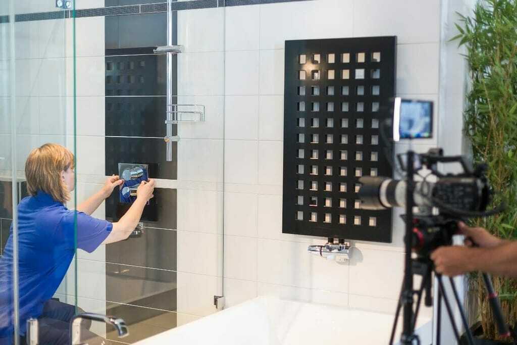 ELEMENTS Wiesbaden unterstützte die Innung Wiesbaden/Rheingau beim Plan eines Imagefilms und bot einen Rahmen für stimmungsvolle Bilder. Rund viereinhalb Stunden wurde in der 600 m2 großen Ausstellung gedreht. Der Film zeigt eine Übergabesituation des fertigen Bades im Haus des Endkunden.
