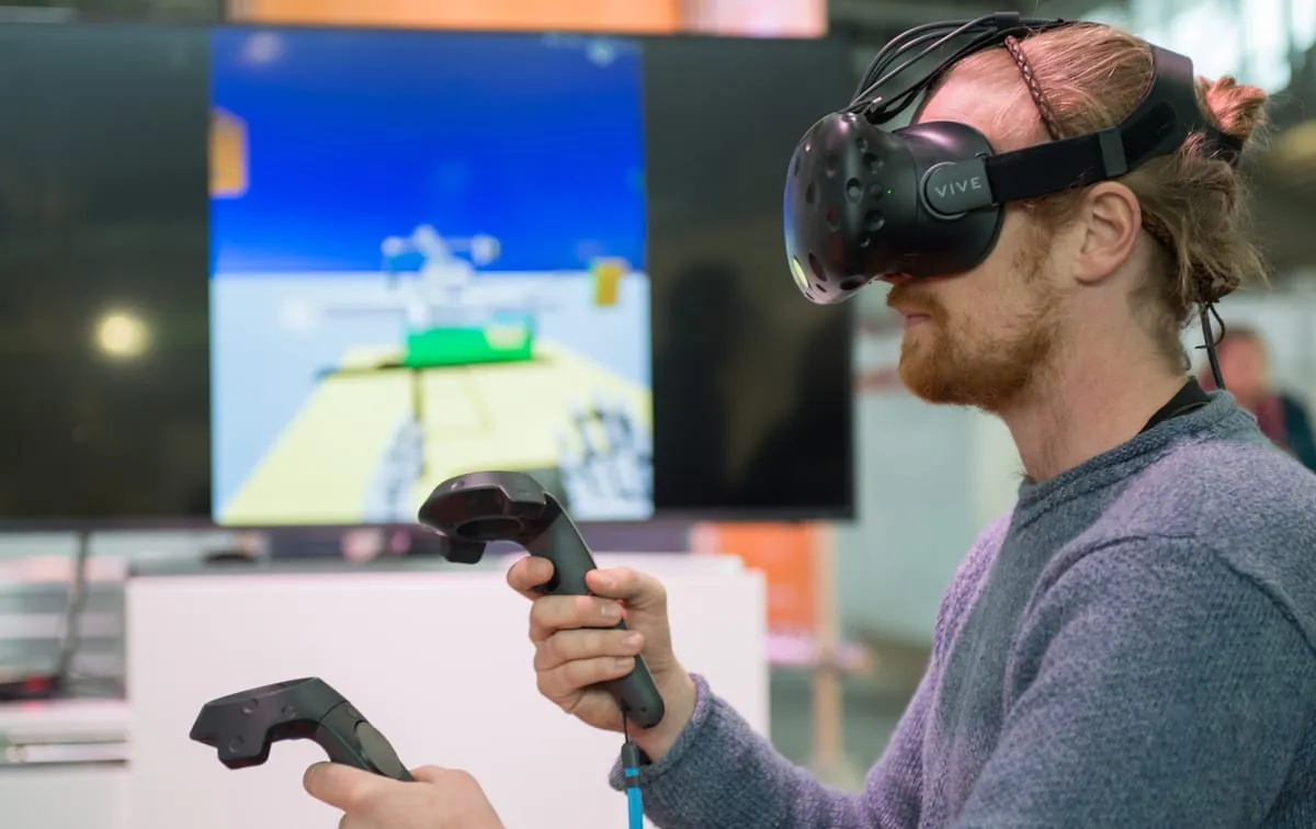 Halle C 2, Stand 211, Virtuelle Wissenvermittlung, Craftguide hier Theo Strauß mit VR Brille in Aktion