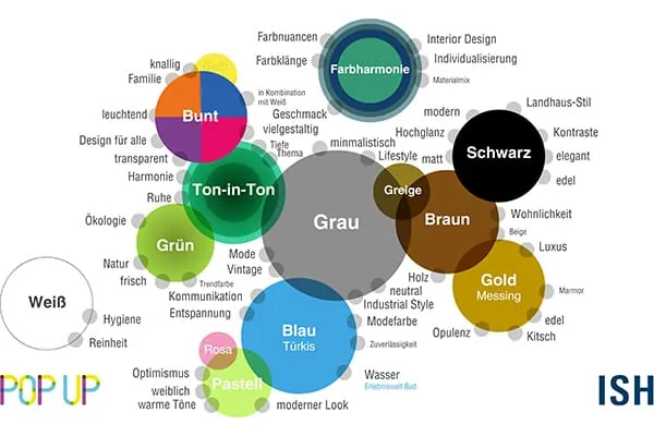 Bereits 2015 und 2017 hat die Frankfurter Messe gemeinsam mit der Vereinigung Deutsche Sanitärwirtschaft e.V. (VDS) mit Pop up my Bathroom aktuelle Gestaltungstrends rund ums Badezimmer präsentiert. Auf der ISH 2019 soll die Inszenierung „Colour Selection“ zeigen, welche Möglichkeiten sich mit den aktuellen Farbtrends im Interior Design für den Sanitärbereich eröffnen. Vor allem zwölf Farbtrends werden die Gestaltung im Badezimmer bestimmen: