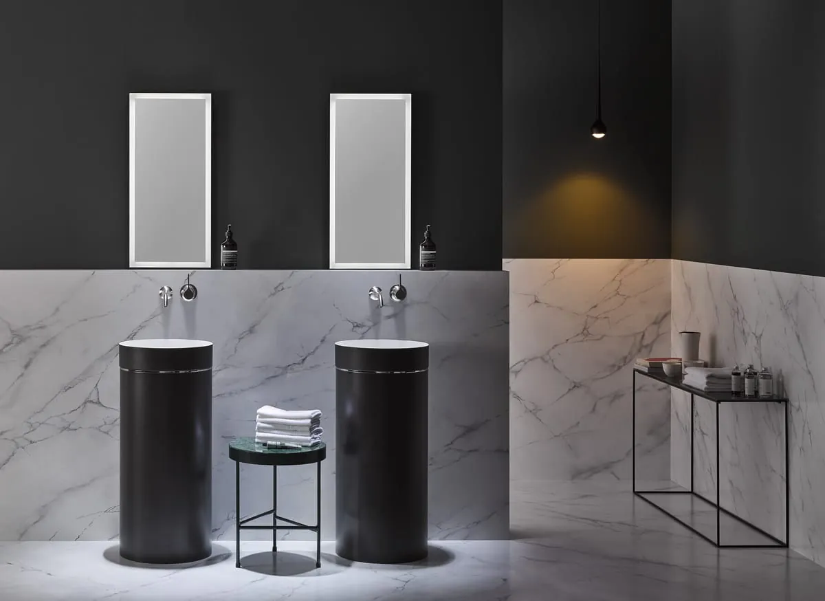 Egal in welchem Stil – die Materialfrage wird gerne durch Nachahmungen gelöst: Bedruckte Duschflächen, Bodenfliesen oder Spritzschutz in Holzoptik oder auch Konsolenplatten aus Verbundmaterialien sollen die Natur imitieren und kombinieren sie mit den positiven Materialeigenschaften des bewährten Produktkanons. Im Zusammenspiel mit passenden Accessoires in ergänzenden Akzentfarben – etwa in besagtem Petrol, Türkis, Orange, einem ins Beige gehenden Altrosa („Millennial Pink“), Ultraviolett oder mit zu Olive und Braun passenden Senftupfern – wird das Badezimmer mit staubfreien Brauntönen zum Lifestyle-Bad.