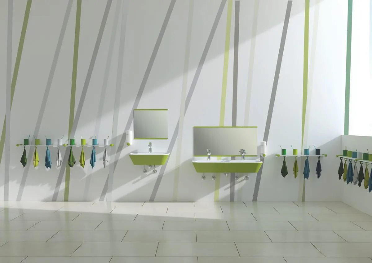 In der Farbtheorie bezeichnet „Buntheit“ die Reinheit des Farbtons. Die reinsten Farben sind somit die Spektralfarben, die eine maximale Farbsättigung haben. Kinder malen gerne mit diesen bunten Farben. Familienbäder oder Badezimmer in Kindergärten variieren diese Buntheit und schaffen so eine angenehme, zielgruppenoptimierte Atmosphäre. Aktuell wird Buntheit aber auch ganz bewusst als Gestaltungselement für Lifestyle-Bäder eingesetzt. Dabei werden tradierte Sehgewohnheiten auf den Kopf gestellt und mit verschiedenen, sehr dominanten Farben gearbeitet. Im Badezimmer werden sich poppige und originelle Farben zeigen, prognostiziert der VDS. Primärfarben geben bei diesem Trend den Ton an. Neben intensiven Rot-, Gelb-, Grün- und Blautönen finden sich aber auch Varianten wie Orange, Violett oder Bernsteingelb. Schon auf dieser ISH werden farbig provozierende Bäder zu sehen sein – von knalligen Waschtischen in Sanitärkeramik bis hin zu transparenten Badmöbeln in Blau und Grün.