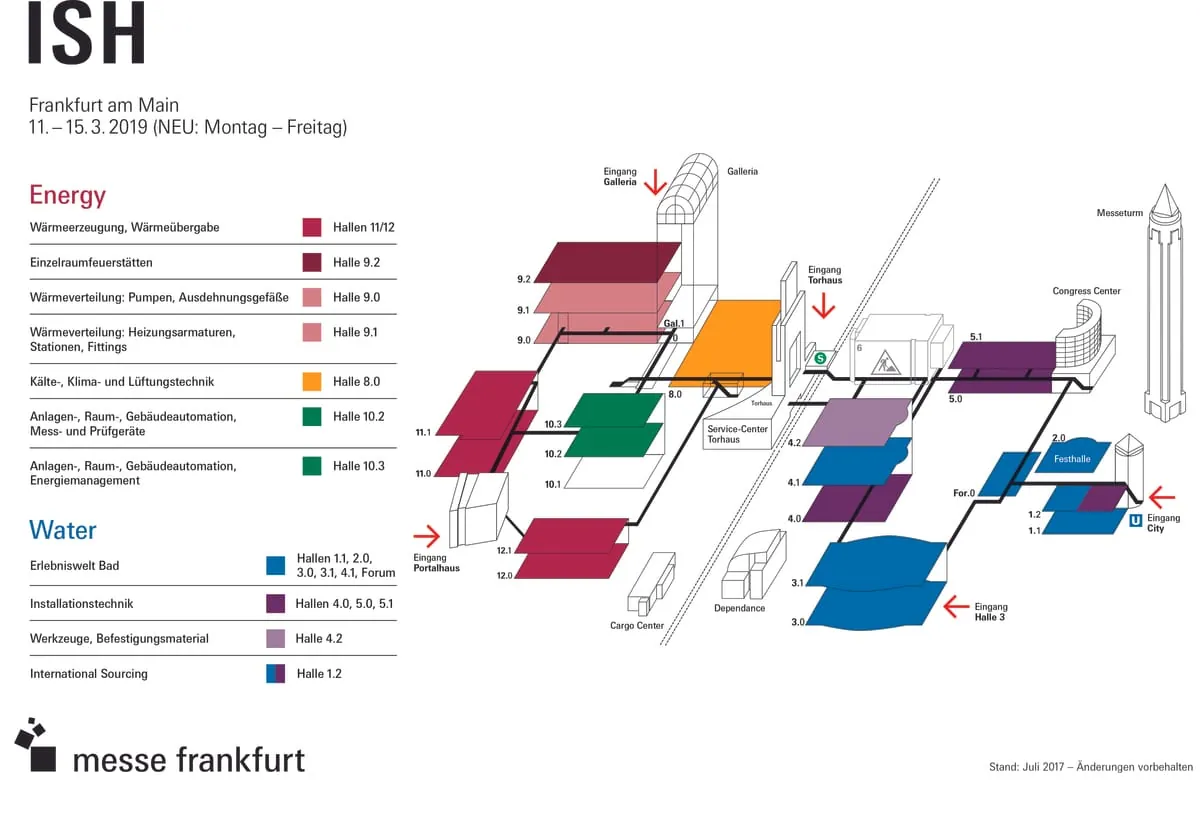Die ISH, Weltleitmesse für den Verbund von Wasser und Energie, profitiert vom Neubau der Halle 12 und stellt sich im Bereich Energy neu auf. Die Messe 2019 ist vom 11. bis 15. März und startet mit neuer Tagesfolge am Montag, statt wie bislang am Dienstag.