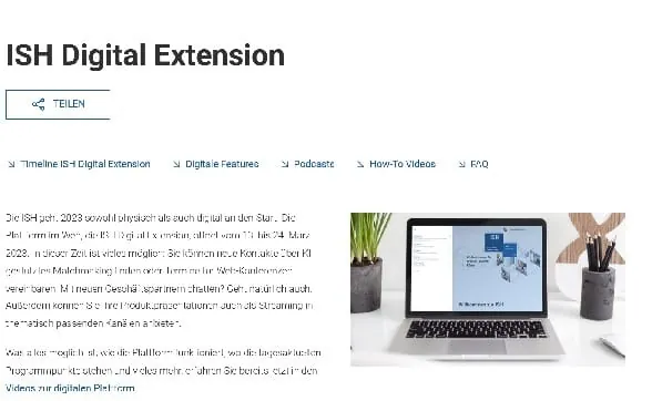 Parallel zur ISH 2023 in Frankfurt und noch eine Woche länger öffnet die begleitende digitale Plattform zum Branchentreffpunkt. Die ISH Digital Extension bietet vom 13. bis 24. März 2023 die Chance digital dabei zu sein. Ein Vorteil ist die Möglichkeit, zielgerichtet Kontakt aufzunehmen. Über KI-gestütztes Matchmaking lassen sich passende Geschäftspartner finden, um mit ihnen auf der Messe oder digital in Kontakt zu treten. Außerdem können Programmpunkte als On-Demand Video zu individuellen Zeitpunkten angesehen werden.