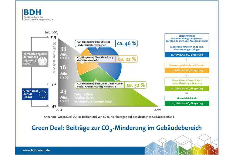Am 11. Dezember 2019 stellte Kommissionspräsidentin Ursula von der Leyen den Green Deal vor. Kern des Programms sind zwei große Ziele. Erstens: Die EU soll bis 2050 klimaneutral werden. Zweitens: Die EU soll bis 2030 ihre Klimagase um 60 % unter den Wert von 1990 bringen. Damit diese ehrgeizigen Ziele gelingen können, müssen alle Wirtschaftssektoren einen aktiven Beitrag leisten. „Wir begrüßen, dass die EU den Klimaschutz so konsequent vorantreibt“, so Uwe Glock, Präsident im Bundesverband der Deutschen Heizungsindustrie (BDH). „Die Heizungsindustrie ist Green Deal ready und kann einen bedeutenden Anteil zur CO2-Reduktion im Gebäudesektor beitragen“.
