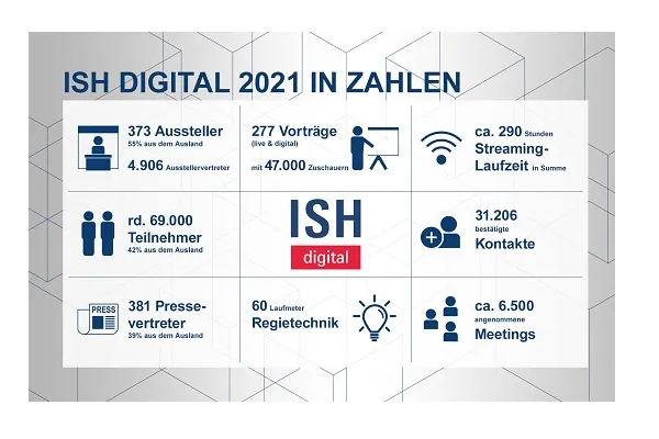 Im Zentrum der Veranstaltung standen von Anfang an Vernetzung, Wissensaustausch, hochkarätiger Content, ein umfangreiches Rahmenprogramm sowie neueste Lösungen und Produktinnovationen der Aussteller. Während des Live-Events vom 22. bis 26. März 2021 wurden insgesamt 290 Stunden Content gesendet. Es fanden 277 Live- und Digital-Events statt, die von über 47.000 Zuschauern aufgerufen wurden. Auf der Plattform waren insgesamt rund 69.000 Teilnehmer – davon 42 % aus dem Ausland – aktiv. Ergänzt wurde die Plattform um das ISH Radio, das rund 29.000 Hörer begeisterte.