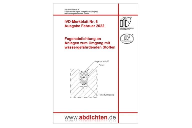 Dieses Merkblatt „Fugenabdichtung an Anlagen zum Umgang mit wassergefährdenden Stoffen“ des Industrieverband Dichtstoffe e. V. (IVD) soll auf die spezifischen Besonderheiten bei der Umsetzung der Forderungen des Wasser-haushaltsgesetzes hinweisen. Es soll Bauherren, Planern und ausführenden Betrieben die wesentlichsten Anhaltspunkte für die fachgerechte Ausführung dieser Fugenabdichtungsarbeiten geben.