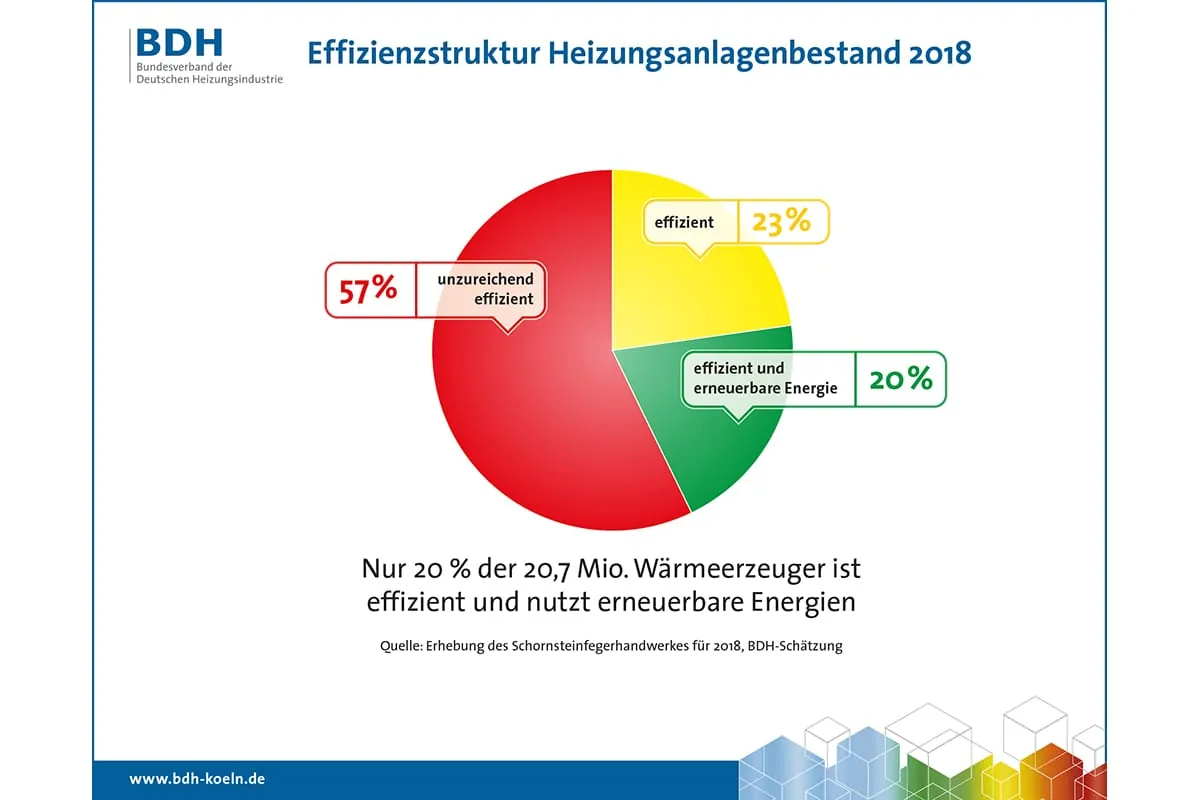 57 % (rund 12 Mio. Anlagen) der ca. 21 Mio. in Deutschland installierten Heizungen sind unzureichend effizient. Das ist das zentrale Ergebnis der Erhebungen, die der Bundesverband des Schornsteinfegerhandwerks (ZIV) und der Bundesverband der Deutschen Heizungsindustrie (BDH) jährlich durchführen.