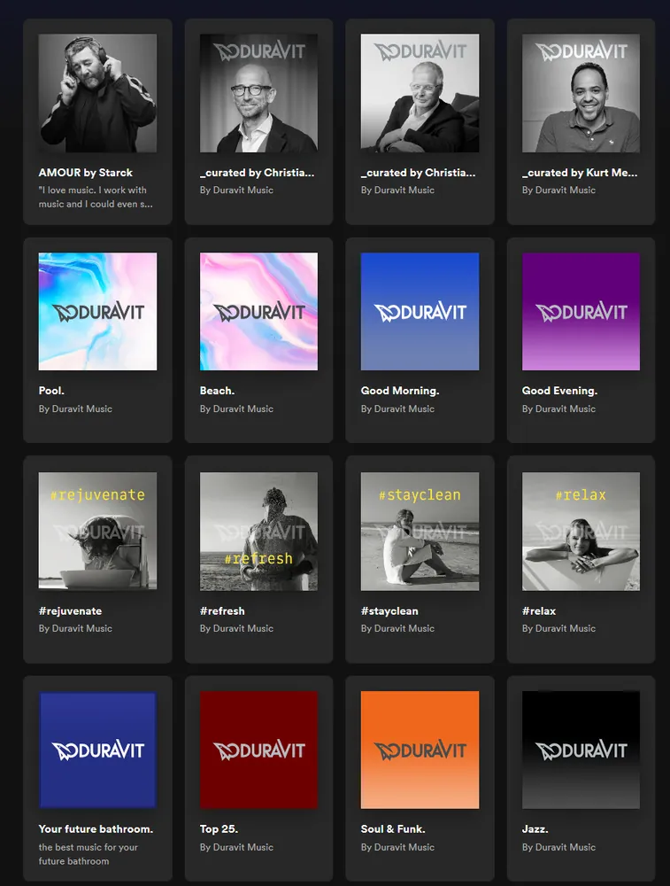 Duravit hat renommierte Designer gebeten, ihre Lieblingssongs zu teilen. Der Spotify Account „Duravit Music“ ermöglicht einen Einblick in deren Musikwelt. Die Playlists sind dabei so unterschiedlich wie die Personen und ihre Entwürfe selbst.