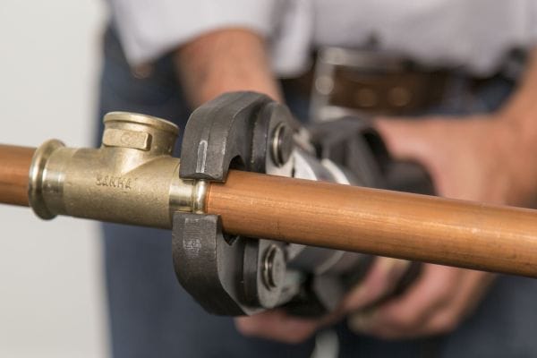 Verpressen vom bleifreien T-Stück-Fitting Purapress an Kupferrohr