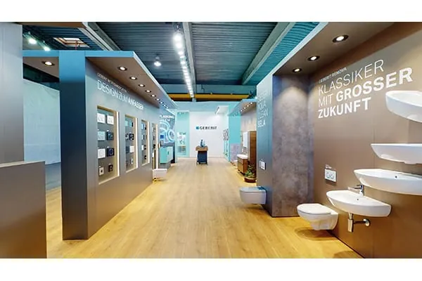 Bei einem virtuellen Messerundgang – der Geberit WebFair 2020 – können sich die Kunden auf Entdeckungstour über den Geberit Neuheiten-Messestand begeben und sich zielgerichtet über die gewünschten Themenbereiche und Neuheiten informieren. Das geht ganz einfach: Der User bewegt sich frei im virtuellen Raum und navigiert so über den Messestand, nur eben digital. Produktneuheiten und Dienstleistungen, die ihn interessieren, wählt er dabei an: Definierte Touchpoints lassen sich per Mausklick oder Fingertipp auf mobilen Geräten aktivieren. Daraufhin präsentiert im Video ein Geberit Verkaufsberater in aller Kürze die wichtigsten Details. Zusätzliche Informationen können in der virtuellen Auslage als Broschüren-Download oder Link zu den entsprechenden Online-Angeboten abgerufen werden.
