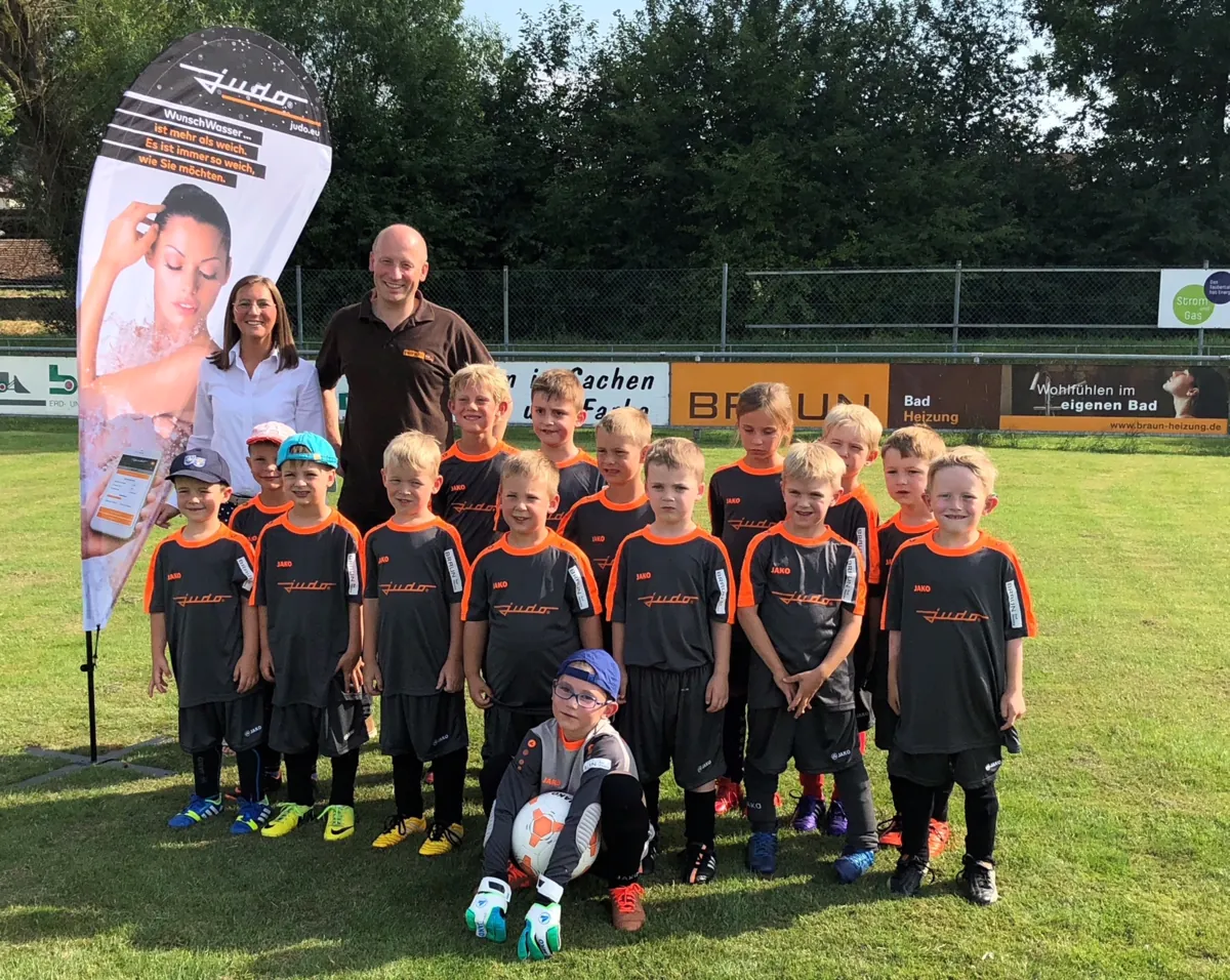 Begeistert werfen die Mannschaftsmitglieder des SV Fleischwangen (Landkreis Ravensburg) in ihren neuen Trikots die Arme in die Luft. Sie sind eine der vielen Mannschaften, die Judo mit einem kostenlosen Trikotsatz ausgestattet hat. „Mit unserer Kampagne unterstützen wir gezielt den Nachwuchs – ein Aspekt, der uns als Familienunternehmen besonders am Herzen liegt “, erklärt Ralf Weißkirchen, Verkaufsleiter Deutschland bei Judo. „Die neuen Trikots schaffen ein einheitliches Mannschaftsbild und fördern den Teamzusammenhalt. Gleichzeitig freuen wir uns als Sponsor natürlich, wenn die Kids in unseren Trikots auf dem Fußballplatz ihr Bestes geben und Spaß am Sport haben.“ Partner-Sponsor ist immer auch ein Installateur oder ein Großhändler aus der Region. „Damit können wir unser gutes Verhältnis zu den Installateuren und den Händlern weiter ausbauen und gleichzeitig den regionalen Bezug stärken“, betont Ralf Weißkirchen. Beim Team des SV Fleischwangen beteiligte sich der Großhändler Pfeiffer & May aus Weingarten.